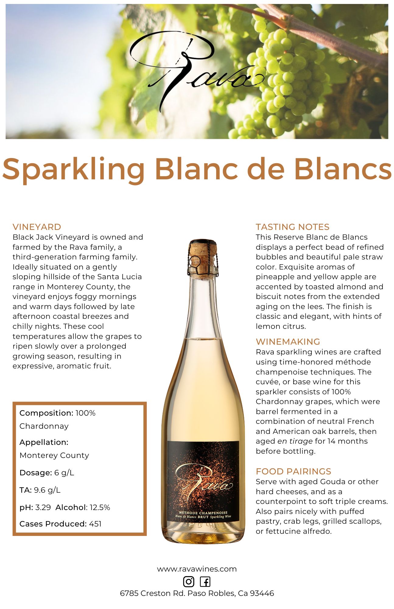 Rava sparkling wines are crafted using time-honored méthode champenoise techniques. The cuvée, or base wine for this sparkler consists of 100% Chardonnay grapes, which were barrel fermented in a combination of neutral French and American oak barrels, then aged en tirage for 14 months before bottling.